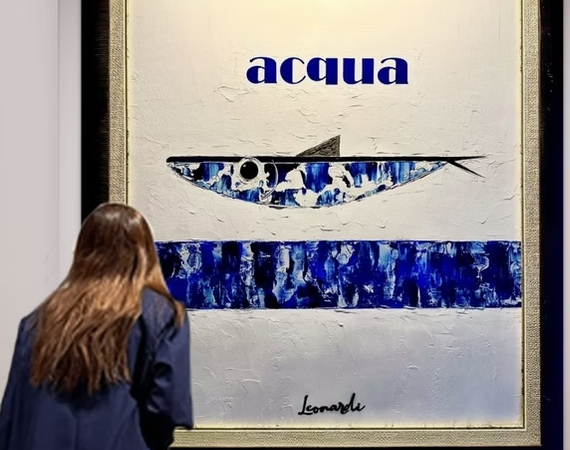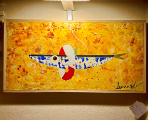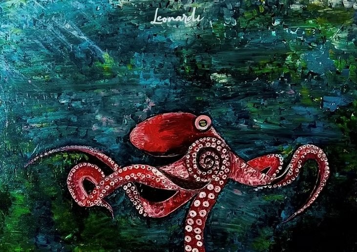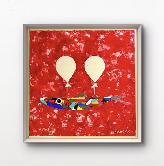 Il mare è il vero protagonista della ricerca di Gabriele Leonardi. Le sue tele sono abitate da pesci, sardine, polpi e creature fantastiche, spesso rappresentati in chiave surreale e immersi in atmosfere cromatiche intense.